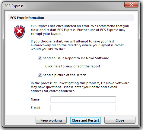 If FCS Express encounters an error that it cannot handle, it will display the following dialog:
