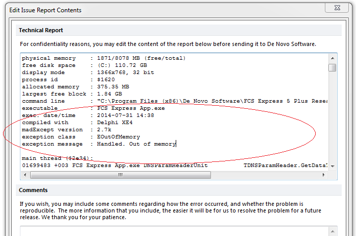 If you see the exception class is EOutOfMemory, then you know the program has run into an out of memory situation. You can see more information in this report, too. For example, it also displays how much physical memory is available on your computer (the line labeled physical memory), and how much memory is currently allocated to FCS Express (the line labeled allocated memory).