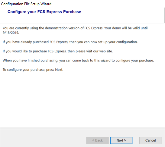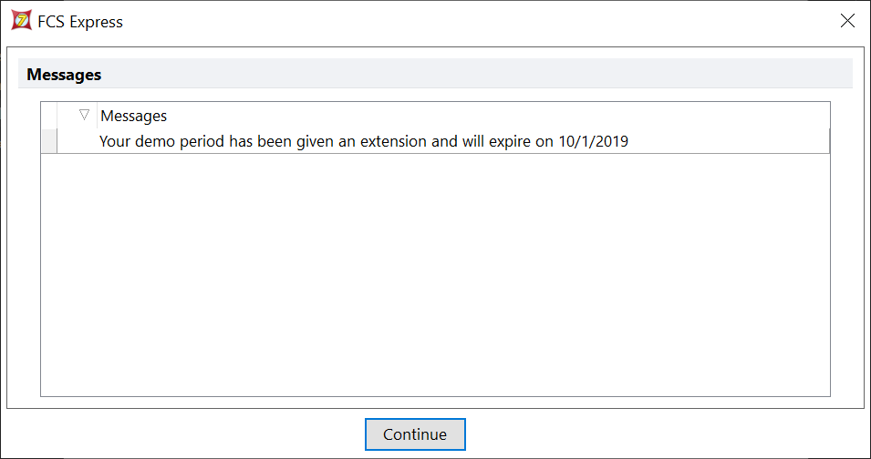 When FCS Express is launched, you will be prompted with a message that states that your FCS Express demo has expired.