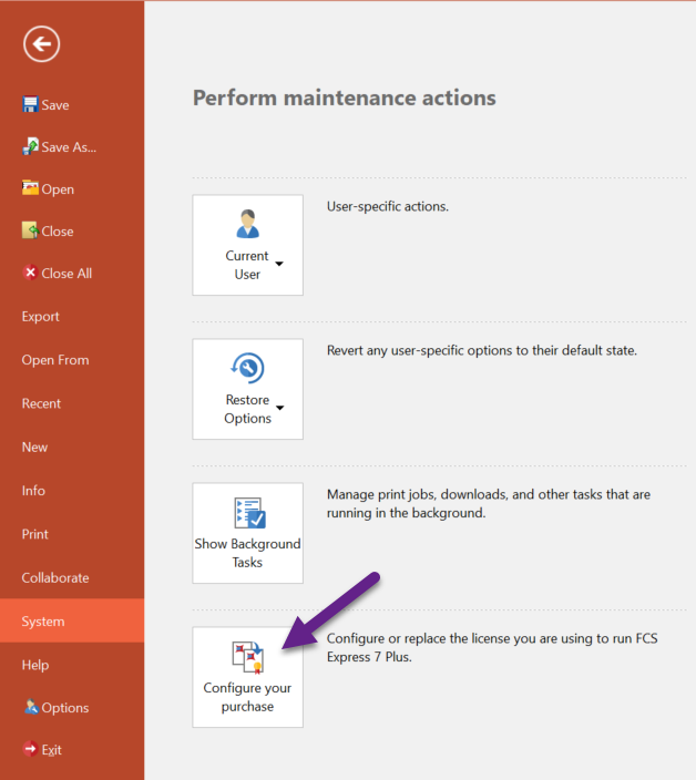 - From File > System, select Configure your purchase.