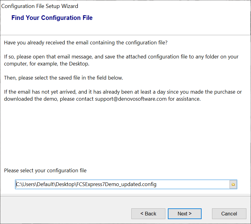 - After confirmation of the extension, click Continue. You can continue logging into De Novo Software account to retrieve an updated copy of the configuration file, or, you can simply quit the wizard to start using FCS Express.