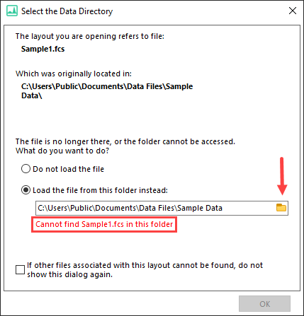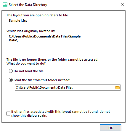 | 4. If the data files that were originally linked to the layout are contained within that folder, the alert within the Select the Data Directory window will disappear.