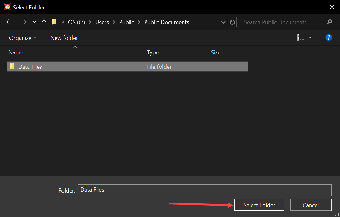 | 3. Select the folder, not the data files within the folder, then select Select Folder. | ![]() |