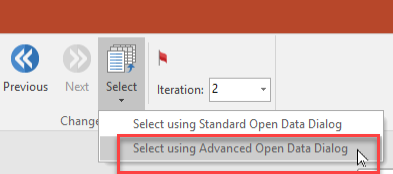 - In the Data tab, within the group called Change Data on all Objects , open the dropdown menu below Select. Click Select using Advanced Open Data Dialog.