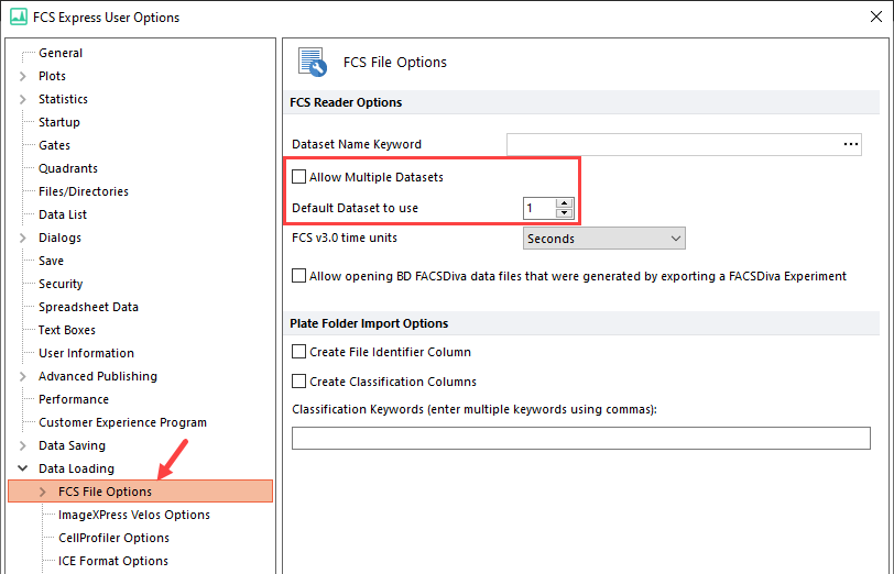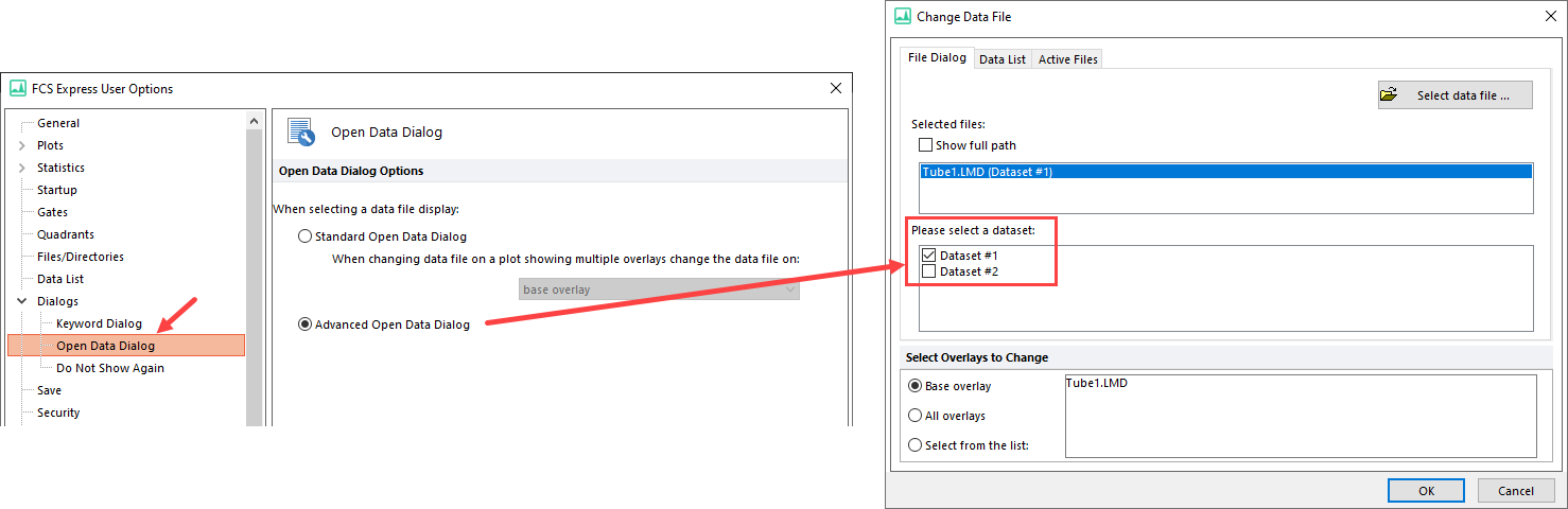 Also, the Advanced Open Data Dialog option will need to be selected to provide the user with the option of which dataset to choose for display. The option to display this dialog can be found from the FCS Express User Options, under Dialogs > Open Data Dialog.