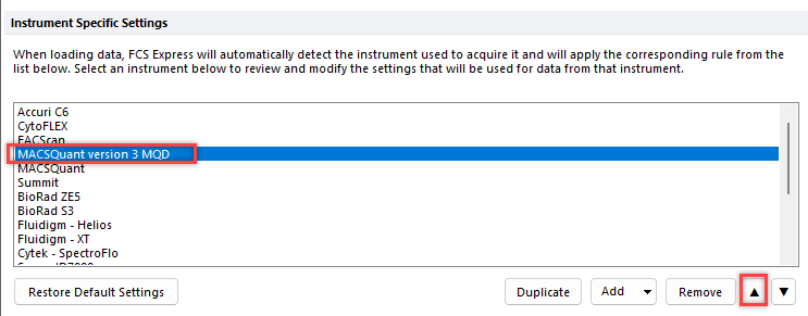 - Move the new setting that you created (MACSQuant version 3 MQD) so that it is listed above the standard MACSQuant setting.