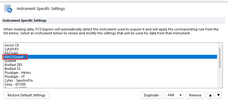 Please follow the steps below to load the MQD files with the appropriate Instrument Specific Settings. Afterward, the plots in FCS Express should appear the same as they appeared in the MACSQuant software, unless the axes were customized within the MACSQuant software.