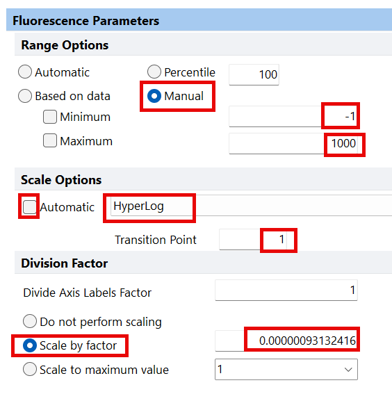 - Under Fluorescence Parameters, under Division Factor, select Scale by factor