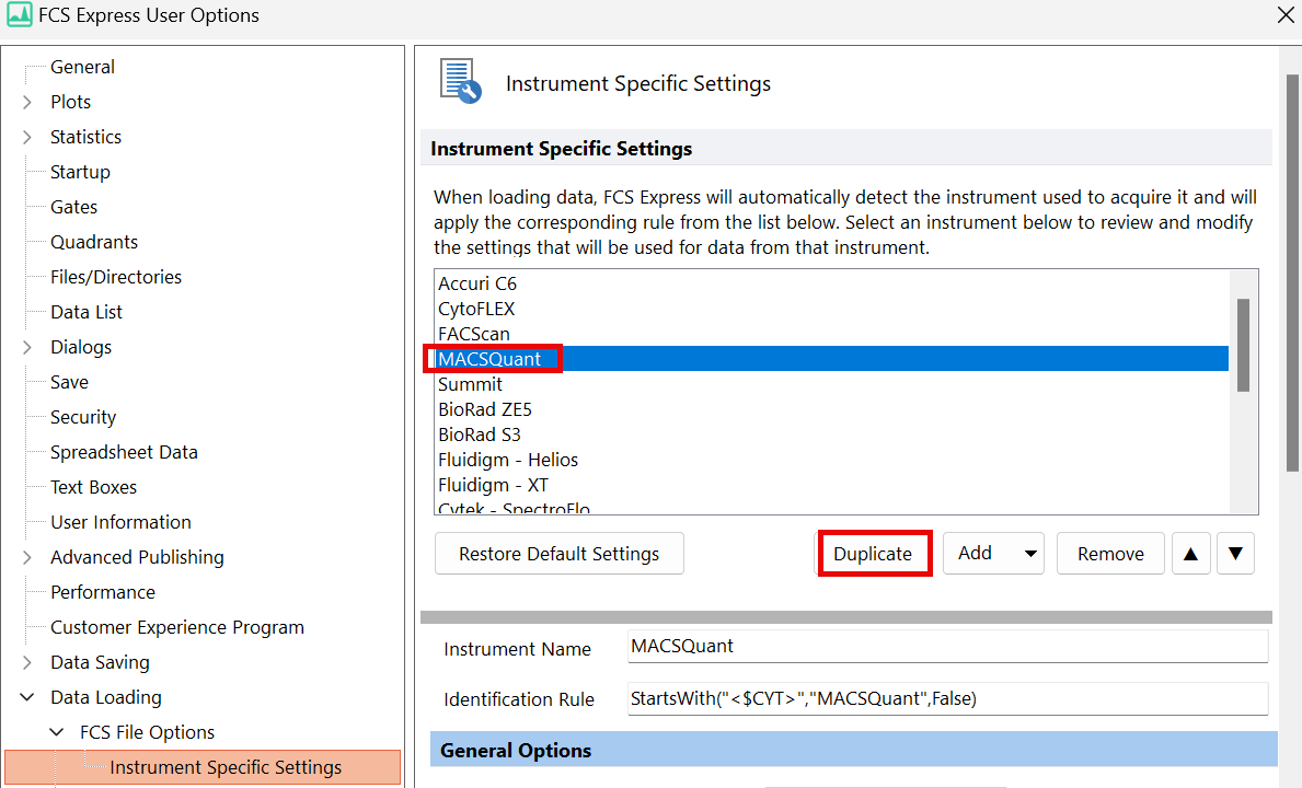- Expand Data Loading, expand FCS File Options, select Instrument Specific Settings
