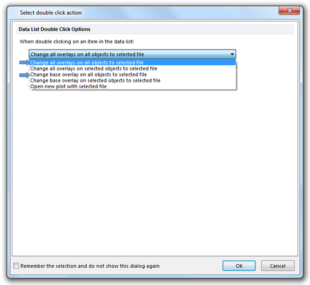 - Double click on a file within the Data List and choose Change All Overlays on Selected Objects to the Selected File or Change Base Overlay on Selected Objects to the Selected File.