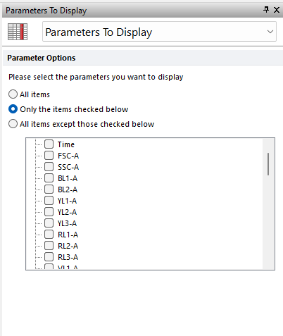 Choose, Only the items checked below. You may then select individual parameters or just Brightfield. In the example below, Event, FSC-A, SSC-A and Brightfield were chosen.