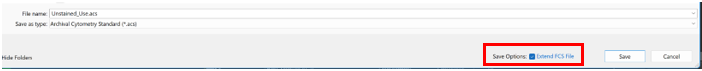 - Before naming the file and clicking Save, check or uncheck the Extend FCS File check box to choose to save data with the extended parameters (examples below).