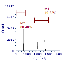 - Create Markers on the histogram via the Gating tab>Marker. The population on the right are events with a "1" in the ImageFlag parameter that have associated images.
