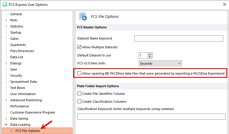 In that case, in FCS Express, access default Options (via File tab > Options), and then in the Data Loading > FCS File Options category, check the checkbox for Allow opening BD FACSDiva data files that were generated by exporting a FACSDiva Experiment.