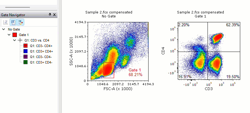 When new quadrants are added to a plot, they are assigned to the hierarchy as children of the Current Gate on the plot. In the example below, the quadrants were created on the right plot. Those quadrants appeared as children of Gate 1.