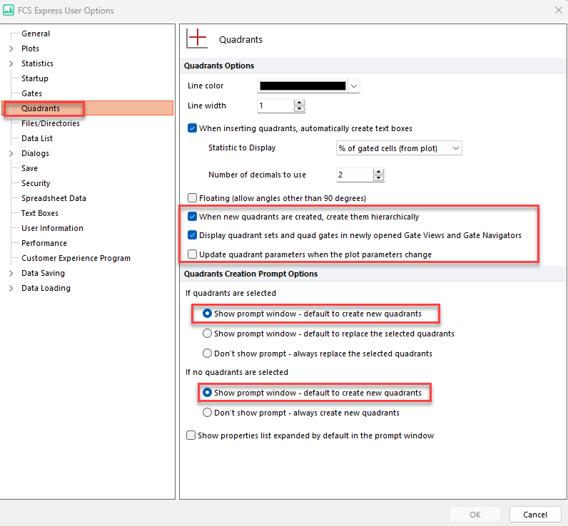 This User Option causes the checkbox "Create quadrants hierarchically" to be checked by default (green arrow in the Create New Quadrants window shown below).