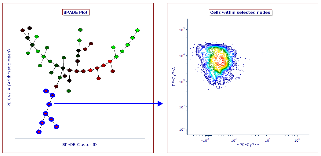 Gates may be defined on SPADE transformed Heat Map plot to select one or multiple nodes for downstream analysis. Similarly, gates created on classical dot plots can be applied to SPADE plots as well.