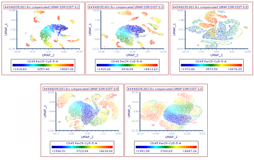In FCS Express, we offer UMAP (Uniform Manifold Approximation and Projection) algorithm as a Pipeline step. UMAP is a dimensionality reduction technique that constructs a high dimensional graph representation of the data then creates a low-dimensional graph to be as structurally similar as possible. This results in the creation of two new parameters UMAP 1 and UMAP 2. UMAP captures local relationships within a cluster as well as global relationships between distinct clusters.