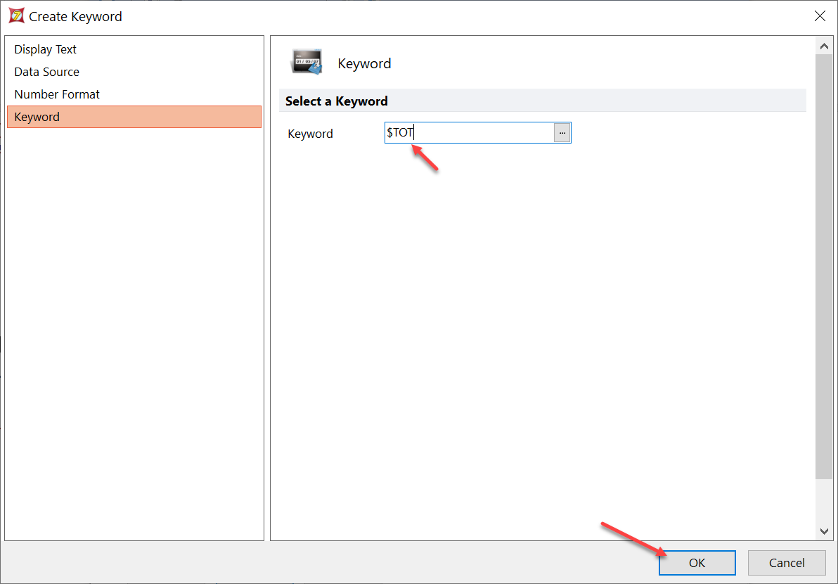 | 25. Select Keyword, then in the Keyword category, type in $TOT for the keyword to use, then click OK. This is the keyword for the total number of events within the data file. | ![]() |