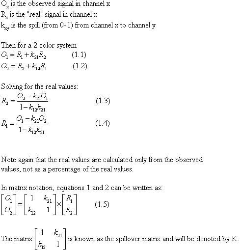 Thus, in order to find the real values for a given parameter, we have to use the inverse matrix. The inverse matrix is a set of coefficients that are multiplied by the observed signals. This is equivalent to FCS Express determining the value of the dials in manual compensation..