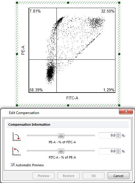 However, to reiterate, there is no difference between how the compensation matrix values are applied, and how manual values would be applied. That is why you can still adjust "automatic" compensation values using the sliders. It just gets very difficult to compensate more than a few parameters "by eye". Also, automatic compensation guarantees that the correct matrix coefficients are calculated based on your single stained controls.