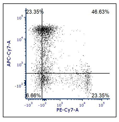 For example, in the plot below, the centerpoint of the quadrants is set at the 30th percentile along the X axis and Y axis. When the arms of the quadrants are each parallel to an axis (and form 90 degree angles), the percentage of events in the Upper-Left and Lower-Left quadrants total 30%. Likewise, the percentage of events in the Lower-Left and Lower-Right quadrants total 30%.