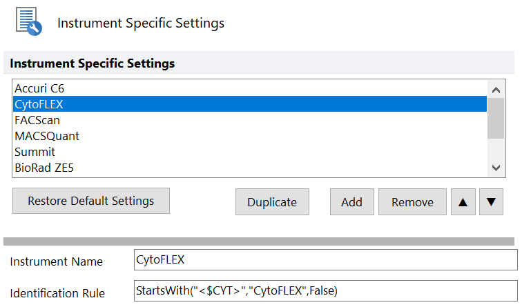 Instrument specific settings are accessed via File tab>FCS Express User Options>Data Loading>FCS File Options>Instrument Specific Settings. Please see the full documentation on editing, adding, and removing instrument specific settings in the FCS Express manual.