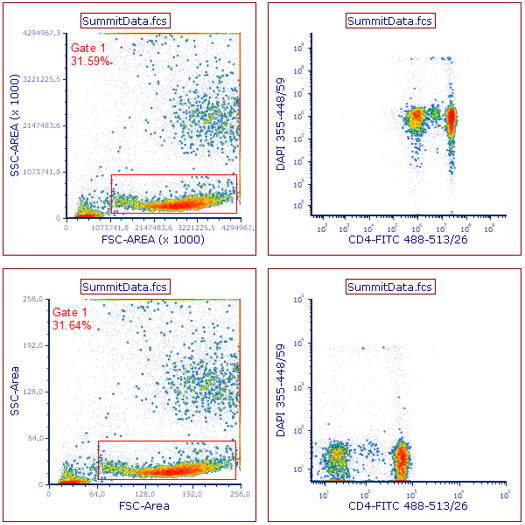 The change in preferences will result in data loaded in FCS Express as it was displayed in Summit Software. The images below show the same data set scaled with the FCS Express default options (top) and with the instrument specific settings updated. (below).