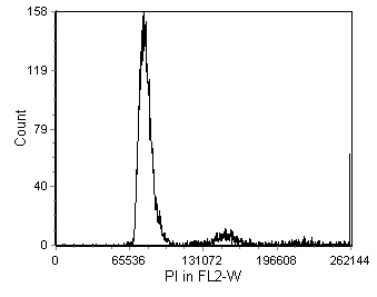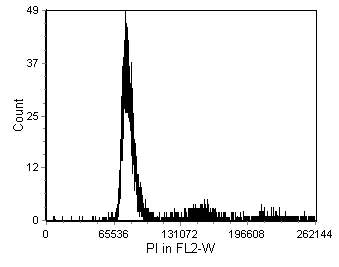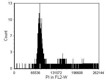 It is important to note that your data is often in much higher resolution than the number of bins (resolution) that you actually want to use for plotting. The question often arises “Why do I want to use less resolution than my data? Aren’t I losing information”. The answer is NO, and quite easy to illustrate. Imagine you have an instrument that has 18 bit data, which has a possible 262,144 channels. Now imaging you have acquired only 10,000 cells. That is only a single cell for every 26 channels or so. If the fluorescence values on the cells were completely random, you would only have one cell every 26 channels. We all know that the fluorescence values are not completely random (or evenly distributed), but even with the clustering of data near a central point (like a mean or median) with such an excess of channels compared to number of events, you rarely get many cells in each channel, and it becomes difficult to visualize the “structure” of the data. This is clearly shown in the figure below.
