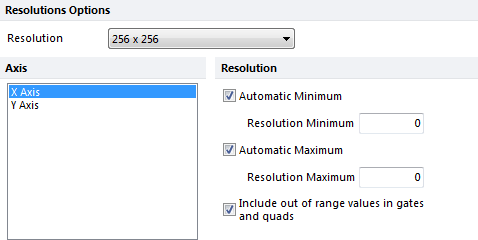 The resolution minimum and resolution maximum settings control which data values mark the start and end of the bins. Data values below the minimum or data values above the maximum will not be included on the plot. These settings allow you to “zoom in” on a certain range of your data and use your full resolution only on a subset of the entire data set, instead of spanning the entire data set. This can be useful if your data spans only a small fraction of the entire plot.