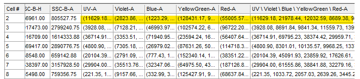 - In my example below, parameters 8-13 are spectral parameters (e.g. Blue-A, Red-A, UV\Violet\Blue\YellowGreen\Red-A). These are the non-numeric that can’t be exported to FCS format.
