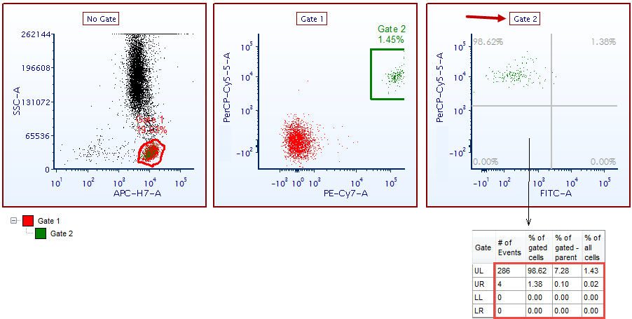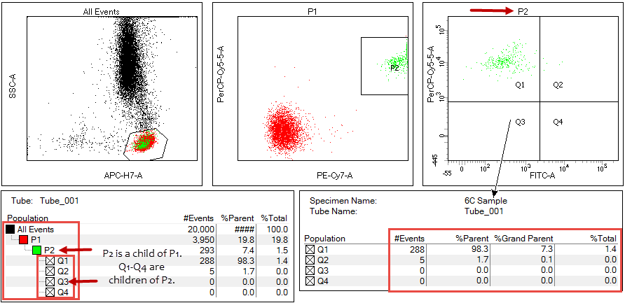 The image below shows a basic analysis of two gates and quadrants. The gate, P1, is the parent of P2, and P2 is the parent of the quadrants, Q1-Q4. As you can see, the statistics are calculated to reflect this hierarchical relationship.