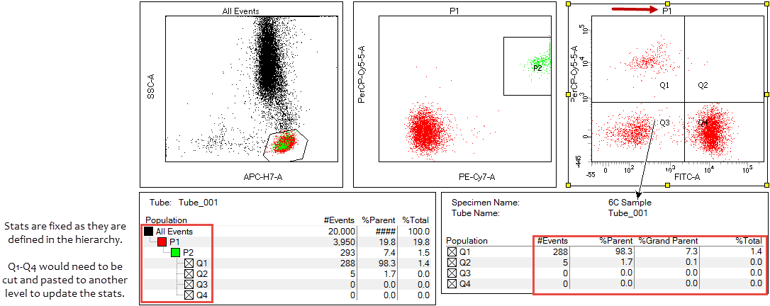 However, that would mean deleting gates and quadrants, or cutting and pasting the gates within the population hierarchy to do this. Because of this static relationship between statistics and the hierarchy, the sources of the statistics % Grandparent and % Great Grandparent will be consistent.