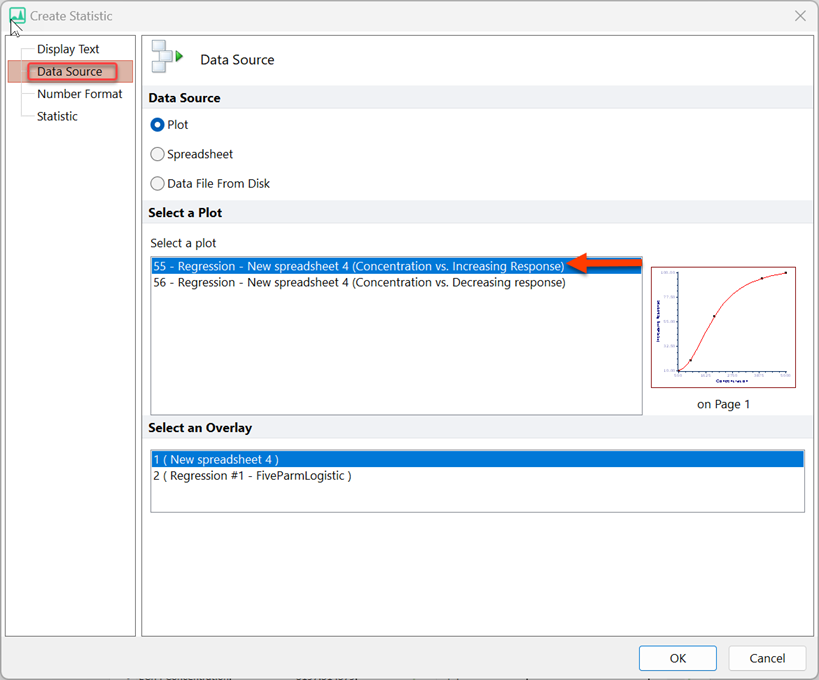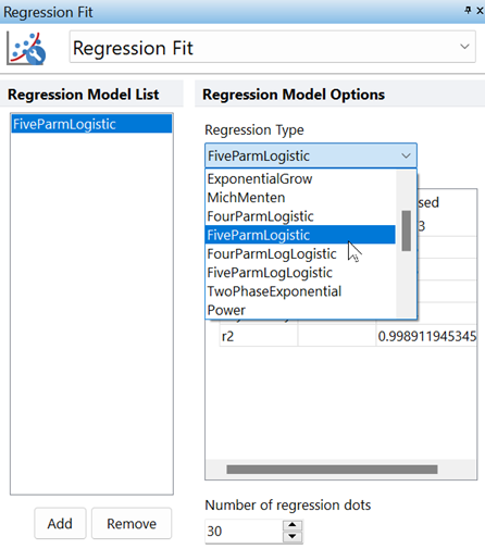 - From here, you can create a scatter with regression plot. This will need to be formatted to a FiveParmLogistic (Five Parameter Logistic) regression Model.