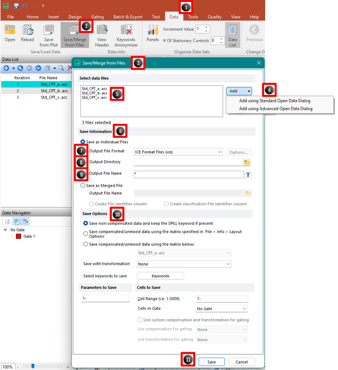 3. On the Data (1) tab select Save/Merge from Files (2) to open the dialog window (3).