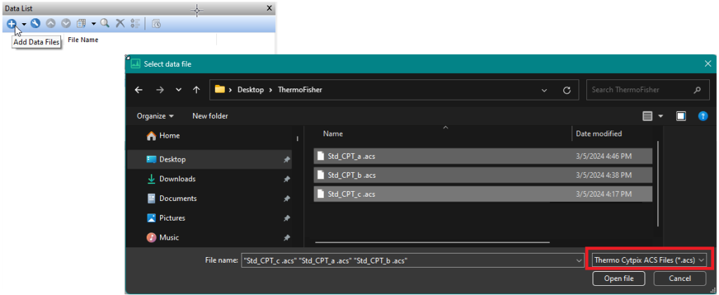 1. Click on blue plus button (+) in the Data List and choose Thermo Cytpix ACS Files (*.acs) from the File Type drop-down (example below).