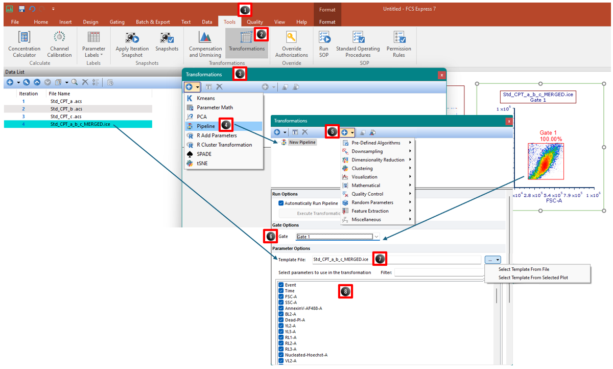8. Select all parameters in the initial pipeline set up so that they are available for additional pipeline steps (8).