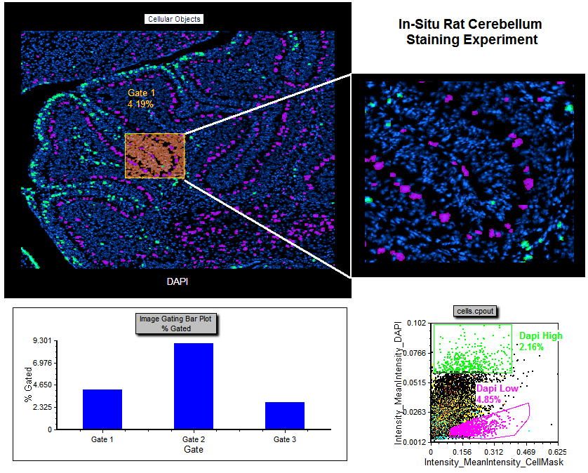 You have carefully planned, implemented, and imaged your multi color in-situ staining experiment resulting in large montaged images containing tens or even hundreds of thousands of cells...now what? After segmentation with CellProfiler, FCS Express can handle these large data sets much like a multi color flow cytometry experiment but with the added advantage of spacial resolution and the ability quickly move from the population level down to individual cells and images. See for yourself by exploring the layout using the free FCS Express Reader: In Situ Rat Cerebellum Staining. You may also download the sample data and run the pipeline yourself using the In Situ Rat Cerebellum Staining Sample Data and pipeline.