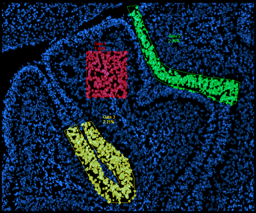 With FCS Express you can make use of numerous 2D plot visualizations, Histograms, Gates (equivalent to thresholding), and advanced statistics to move between images, plots, and cell galleries to get information on populations, sub-populations, and even the single cells.