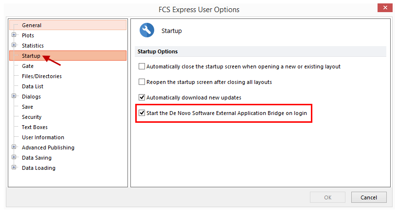 FCS Express integrates R via an External Application Bridge that is enabled in the User Options. Access the File tab→Options→Startup category and check the box for Start the De Novo Software External Application Bridge on login.