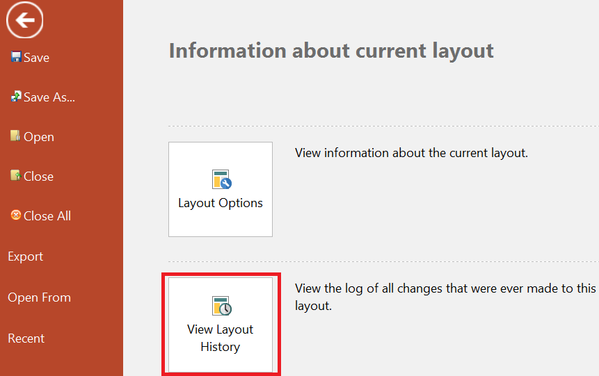You can view a layout's history and print it from the Layout History Viewer, which is accessible by clicking File tab > Info > View Layout History button (outlined in red below).