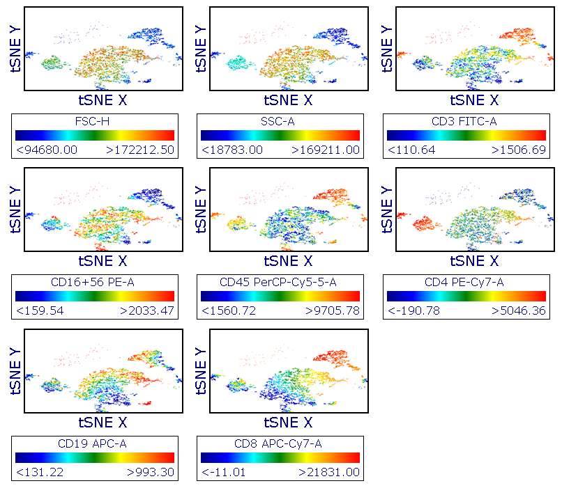Creating a multi plot of color by parameter from a density plot source with tSNE applied will allow you to quickly and easily create tSNE X vs tSNE Y plots for all selected parameters. |