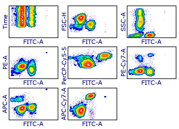 | Multi plots may also be created on all NxN combinations of parameters or conveniently for only compensated parameters. When using the NxN Plots or NxN Plots Compensated feature an additional row of all parameters as histograms will be present as the top column. With any multi plot group all individual plots may be accessed, formatted, and removed from the group just as you would work with groups of images in PowerPoint. The new grouping technology allows you to quickly create graphs to get the big picture of your data set while also allowing you to access just the plots you need for analysis and reporting. | ![]() |