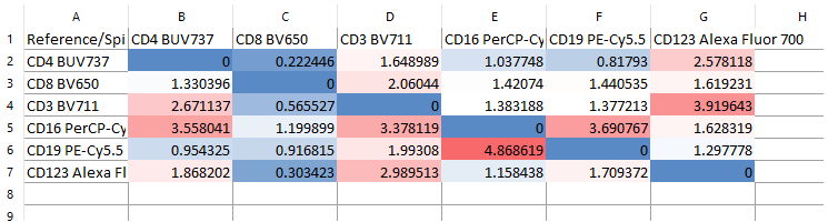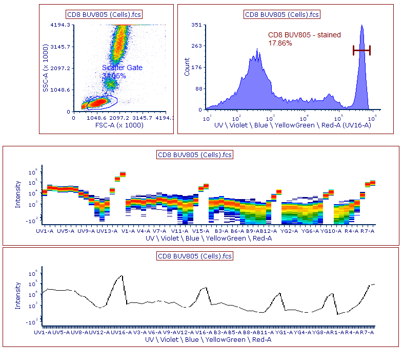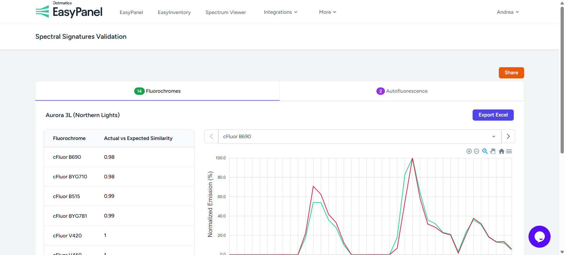 View your single color controls in a spectra viewer on the EasyPanel website. The actual spectral signature automatically gets compared to the expected signature for that fluorophore. A similarity score is calculated.