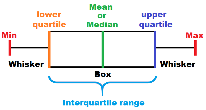 - Box and Whisker: the distribution of the data is visualized in quartiles, where the middle two quartiles are represented by a mean- or median-bisected box, and the outer two by whiskers. Individual data points within each set may also be denoted by points, and the appearance of outliers can also be visually emphasized.