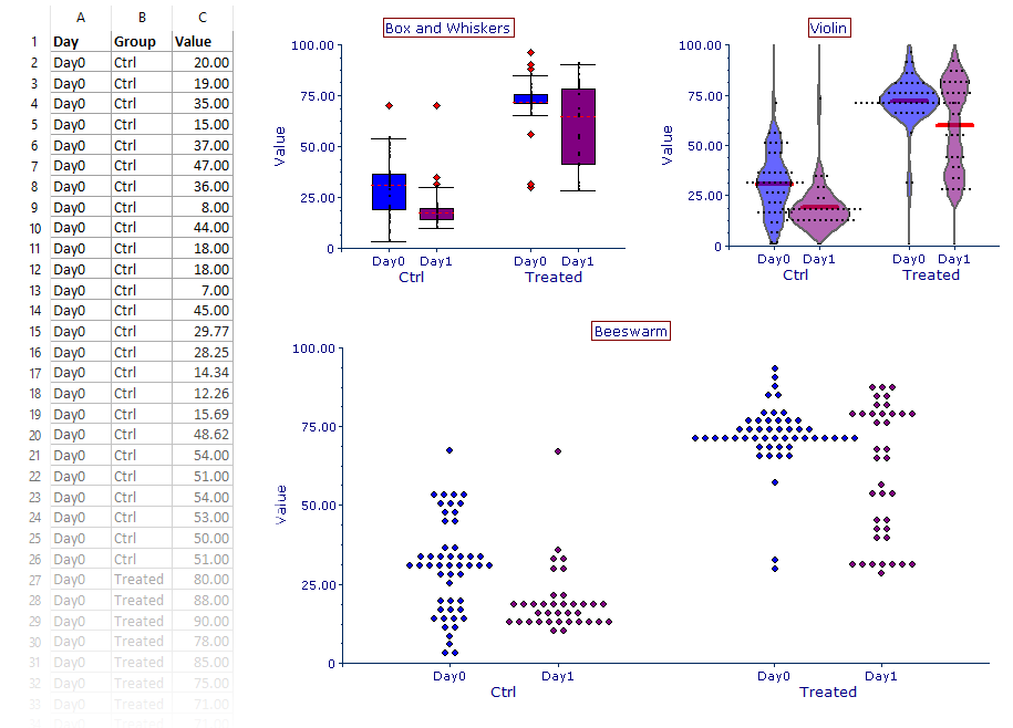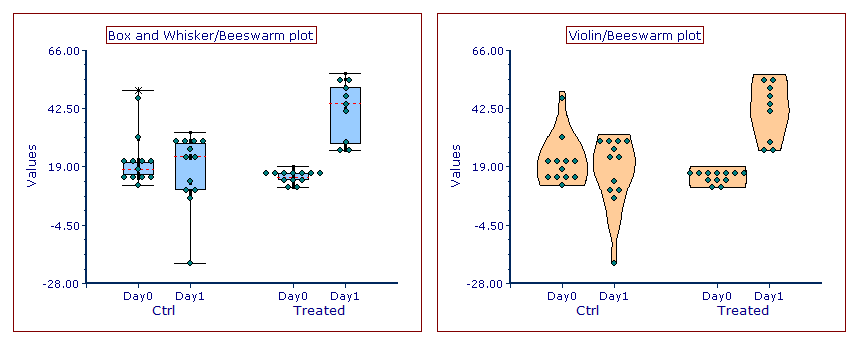 All elements (color, line, outliers, etc.) of Summary Charts can be fully formatted to your specifications. You can even create hybrid-type plots that mix the formatting elements each kind of Summary Chart (e.g., Beeswarm with Box and Whisker [below left] or Violin [below right]).