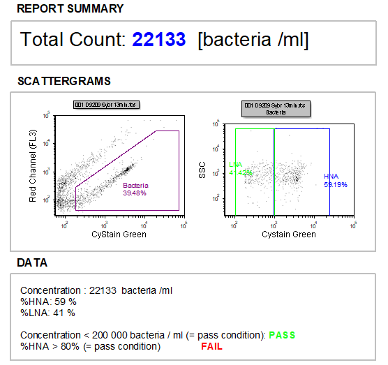 Bacterial cells counts is a common application in Flow Cytometry. FCS Express provides a way to conveniently report all counts, calculate custom statistics, and display data for visualization. Full reports make consolidating and collating results quick and easy. The ability to create your own custom classifications also makes quality control easier than ever.