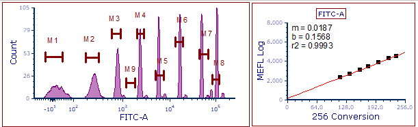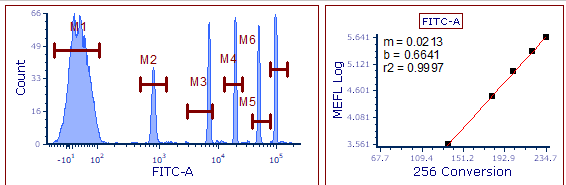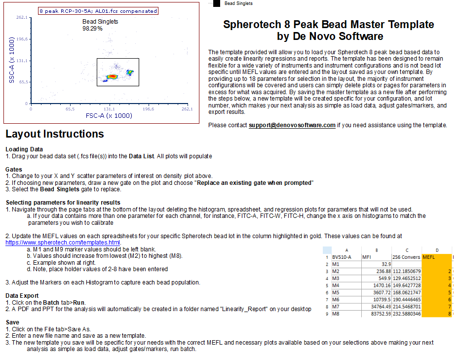 De Novo Software and Spherotech have recently collaborated to provide FCS Express analysis layouts for easy analysis and reporting of Spherotech's 6 and 8 peak calibration particle kits. The FCS Express layouts allow users to easily load data acquired from any cytometer, adjust the layout to the specific configuration of the cytometer, and easily report all linearity results at a click. The layouts can then be saved so they are specific to your own cytometer configuration and used over and over again greatly simplifying analysis by eliminating the need to use multiple software packages or Excel spreadsheets.