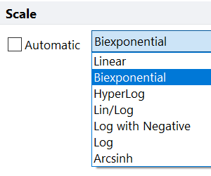When you need to change between different axis scalings simply choose from the FCS Express drop down which scale to apply to your data. All commonly used axis scalings for flow cytometry data analysis are available for use.