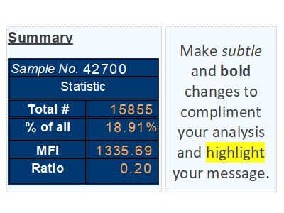 Emphasize your results by formatting your fonts, adding bullet points, changing line spacing, and other text editing functions with which you know from using Office. The best part is your fully-formatted text boxes and results will update as gates and data files change.